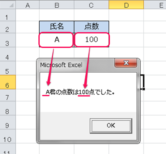 メッセージボックスにはB3セルとC3セルの値を引用した「A君の点数は100点でした。」というメッセージが表示されました。