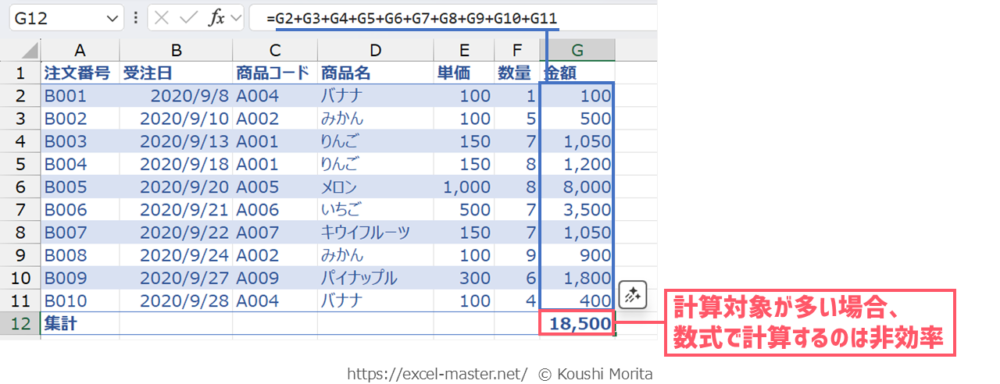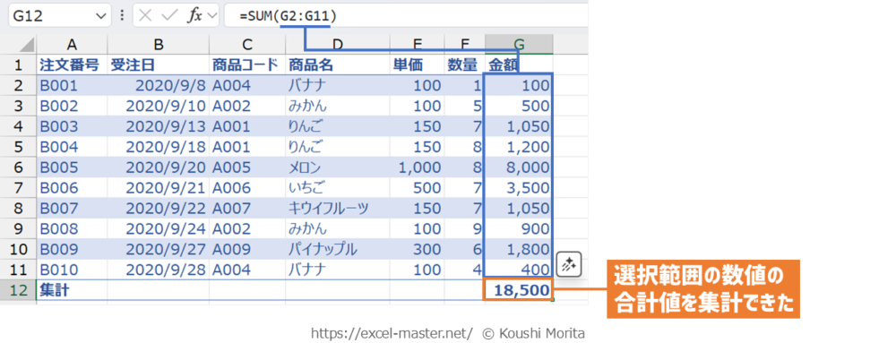 一例として、加算の数式と同じセル範囲(「金額」列)をSUMで集計したものが以下です。