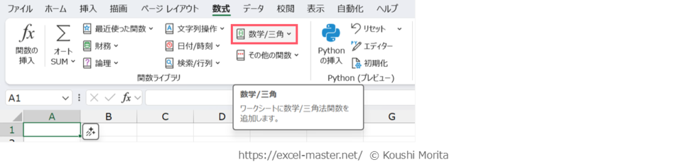 あくまで参考情報となりますが、SUMはリボン「数式」タブの関数ライブラリの「数学/三角」に分類されています。