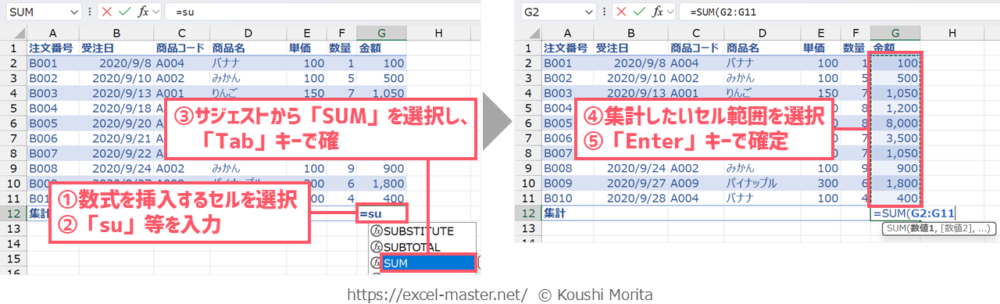 - サジェストから「SUM」を選択し、「Tab」キーで確定
