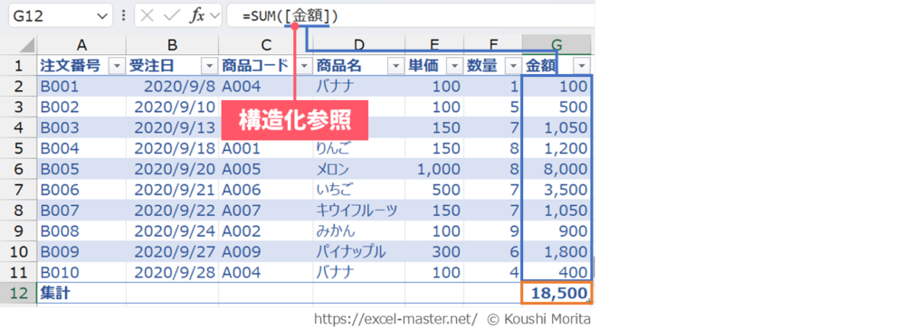 上記のSUMの数式で参照したセル範囲は「[金額]」となっており、テーブルの「金額」列のすべてのセル(見出し除く)を参照している意味となります。