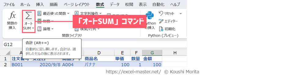 関数の数式に不慣れなうちは、リボン「数式」タブにある「オートSUM」コマンド(オートサム)でSUMをセットしている方もいます。