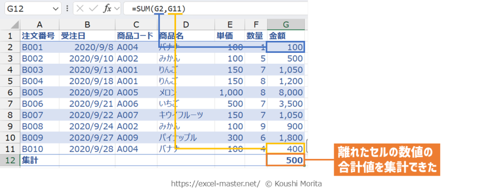 SUMは連続するセル範囲を対象に合計を集計することが実務上多いですが、離れているセルも集計できます。