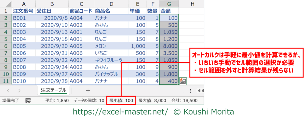 Excelで最も手軽に数値データの最小値を計算する方法は、該当のセル範囲を選択することで計算結果をステータスバーに表示させる「オートカルク」です。