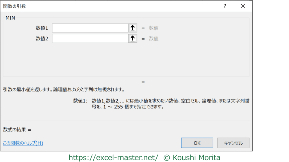 引数「数値n」で指定した値がすべて数値以外の場合、MINの戻り値は「0」となる。