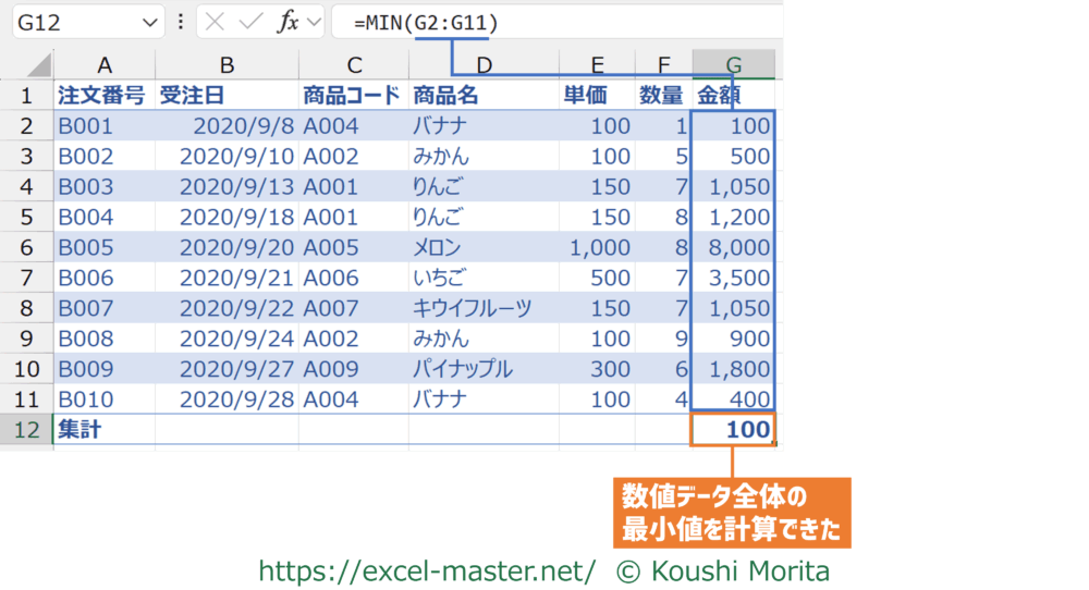 MINを使うことで、指定した数値データの最小値を自動計算できます。