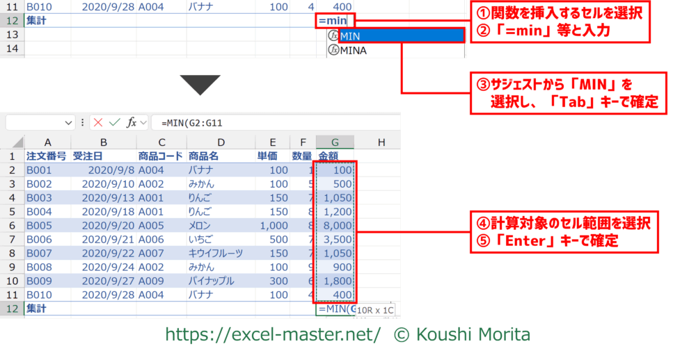 - サジェストから「MIN」を選択し、「Tab」キーで確定