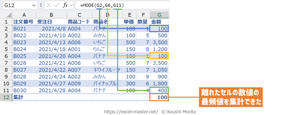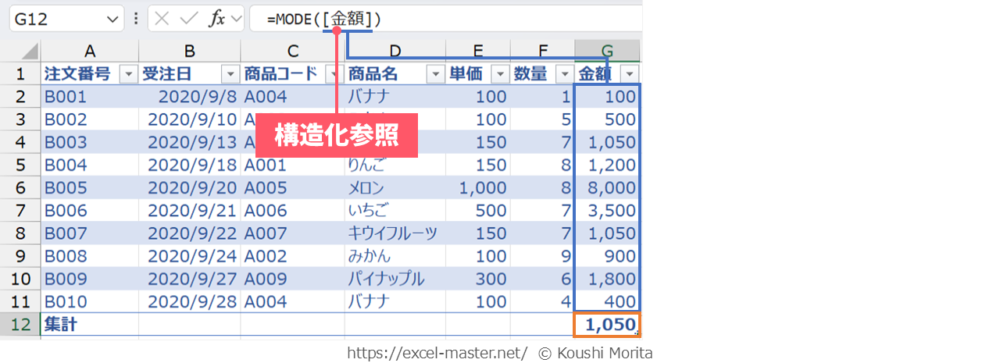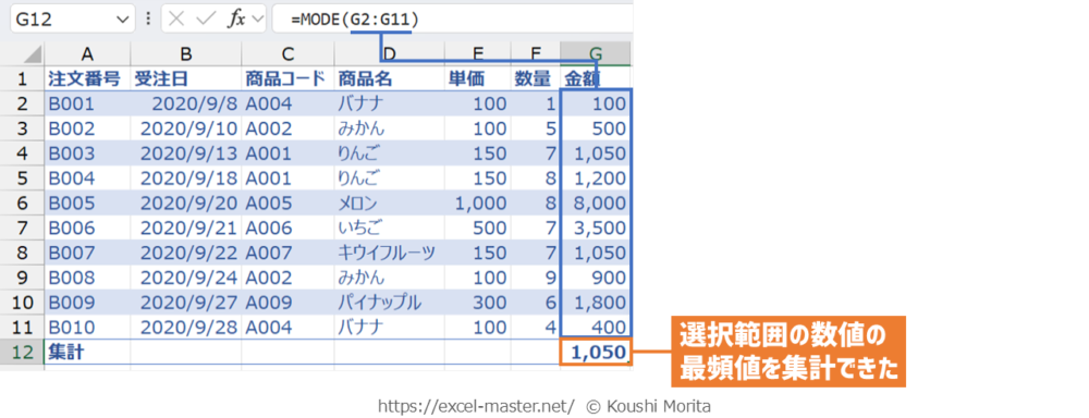 一例として、「注文テーブル」シートの「金額」列を対象にMODEで集計したものが以下です。