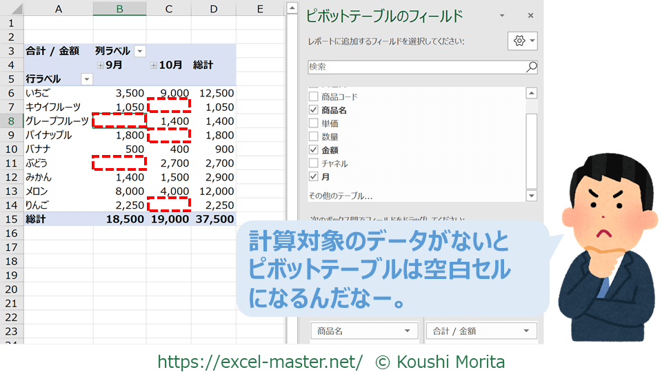 ピボットテーブルレポートは計算対象がない場合、空白セルで表示される