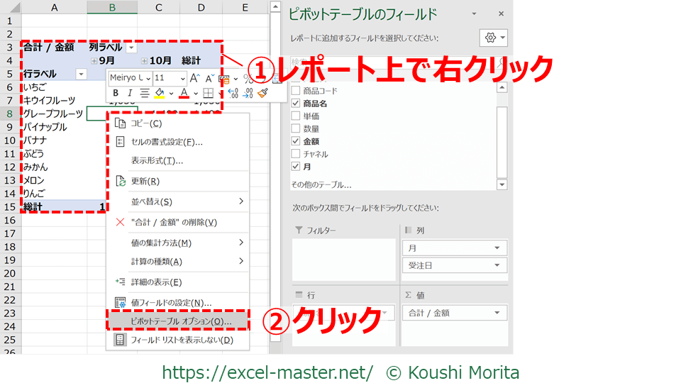 まず、ピボットテーブルレポートのいずれかのセル上で右クリック(①)し、「ピボットテーブルオプション」をクリック(②)します。