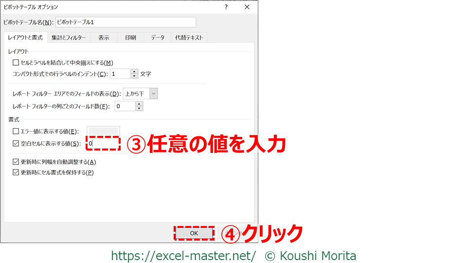 ダイアログ下部にある「空白セルに表示する値」のボックスへ任意の値を入力(③)し、「OK」をクリック(④)すれば完了です。