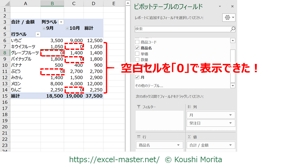 今回は空白セルだった部分が「0」で表示されるようにできました!