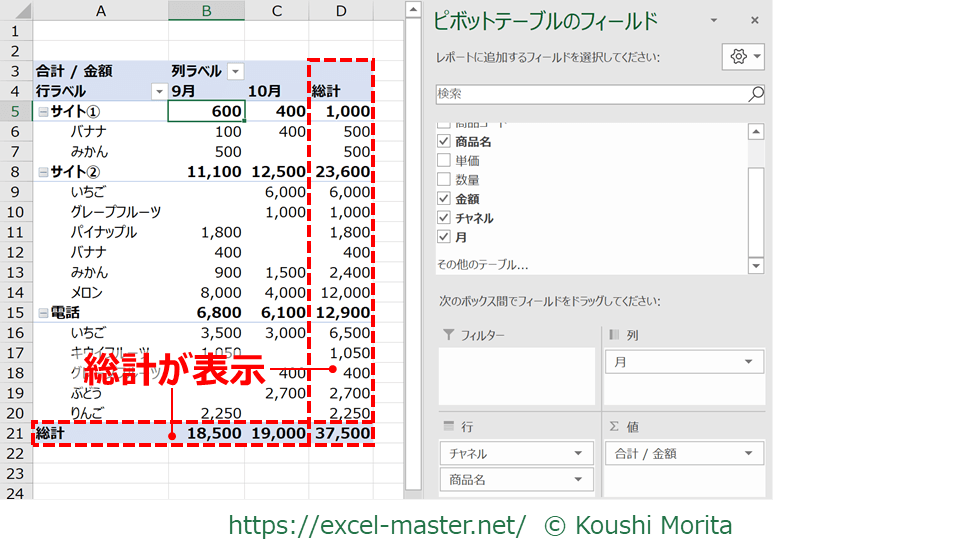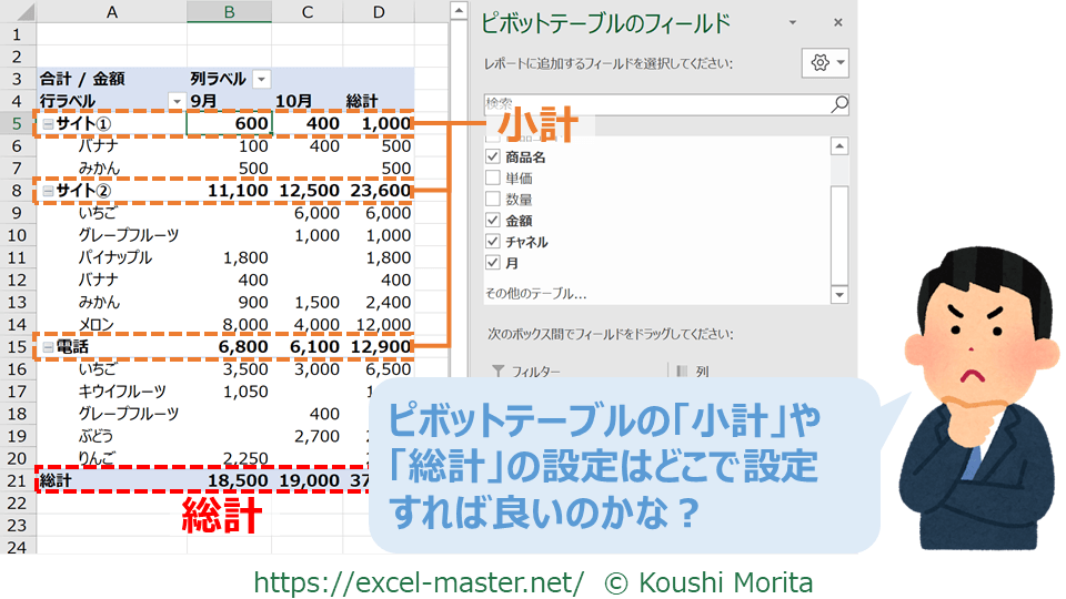 なお、ピボットテーブルの「小計」と「総計」の設定は基本的にほぼ同じ流れです。