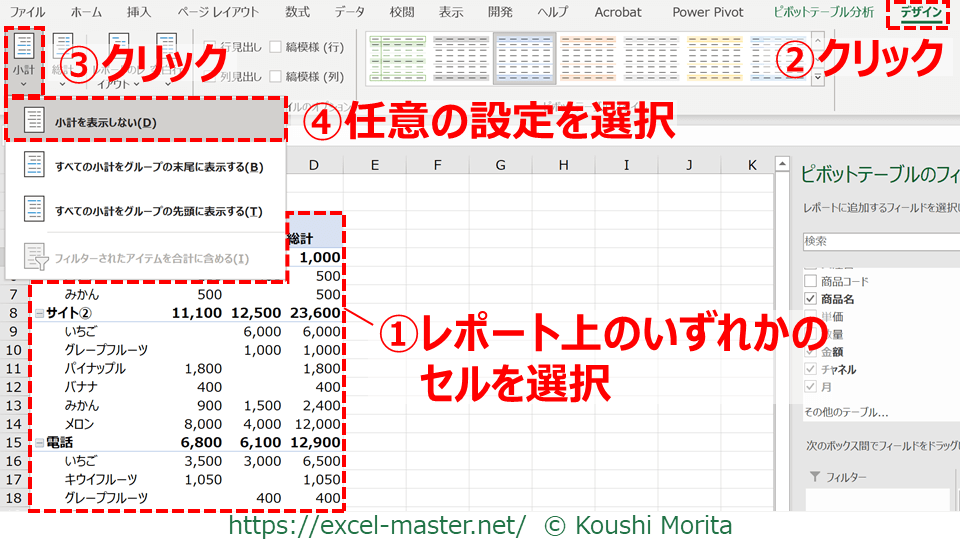 ピボットテーブル上の小計や総計を非表示にしたい場合はどうしたら良いですか?
