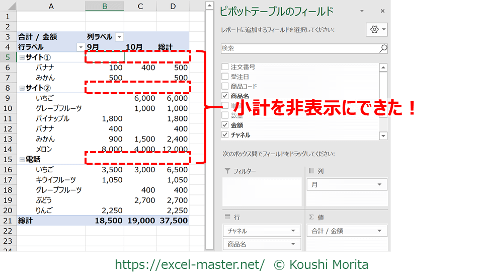 しかし、ピボットテーブルレポートだと数回のクリックで小計・総計の出し入れが簡単なので、めちゃくちゃ便利なのが嬉しいですね!