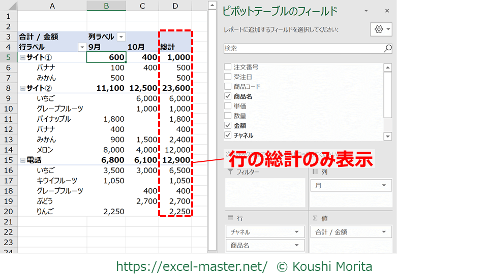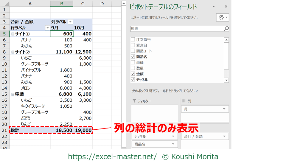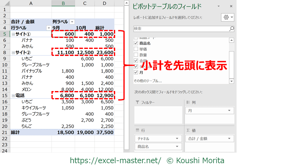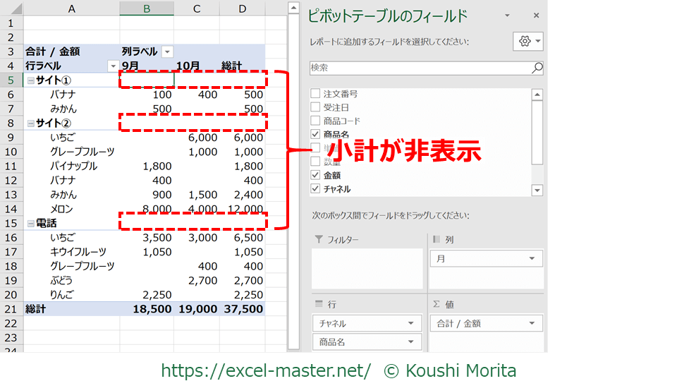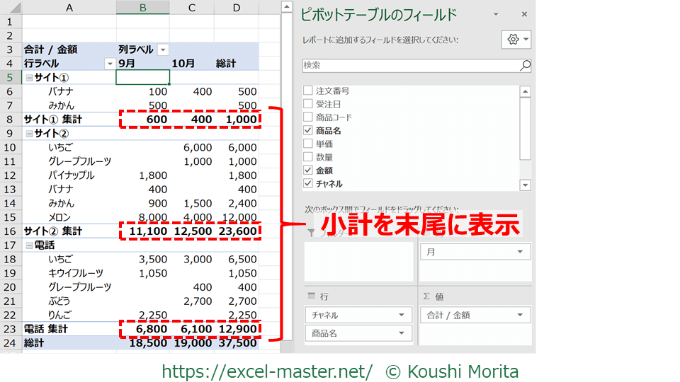 上図で言えば、「チャネル」が上位の階層なので、各チャネルの合計値が小計となっています。