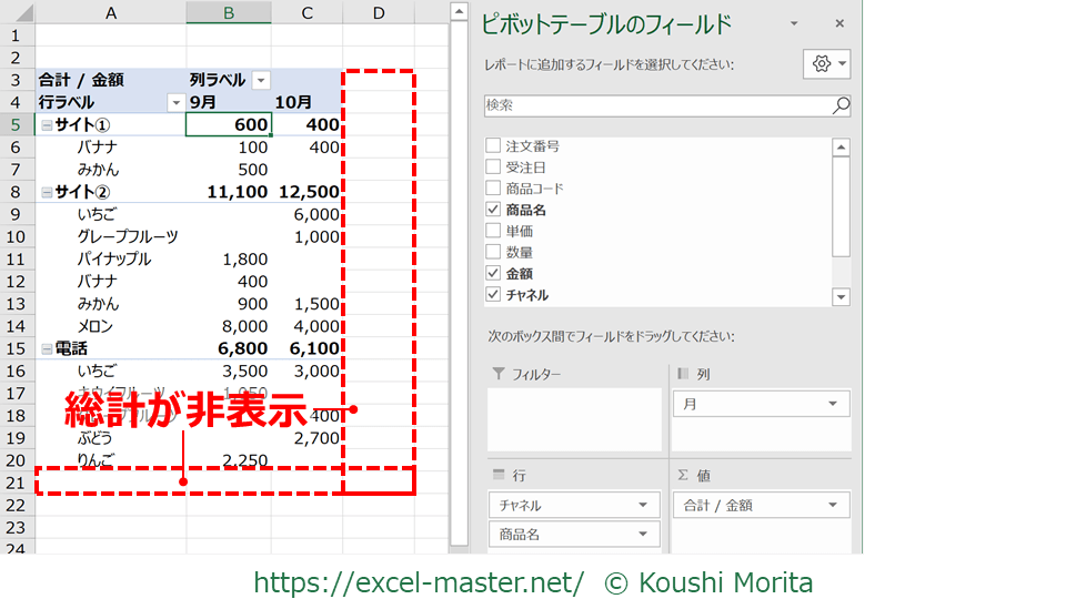 今回は各チャネルの小計を非表示にすることができました!