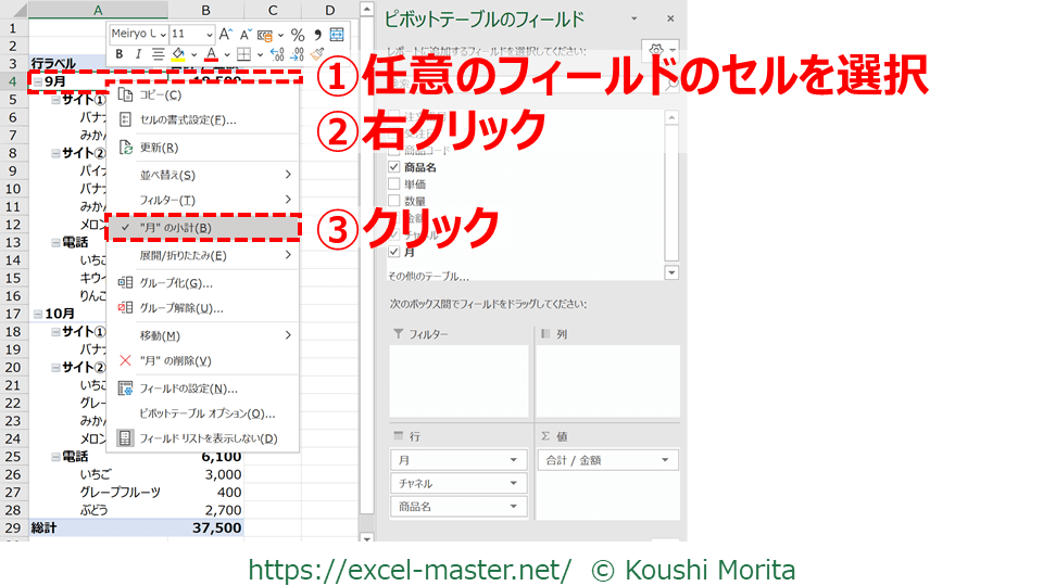 あとは、右クリックメニューから「”フィールド名”の小計」をクリック(③)すればOKです。