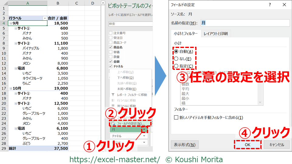 続いて、「小計」をクリック(③)し、任意の設定を選択(④)すれば完了です。