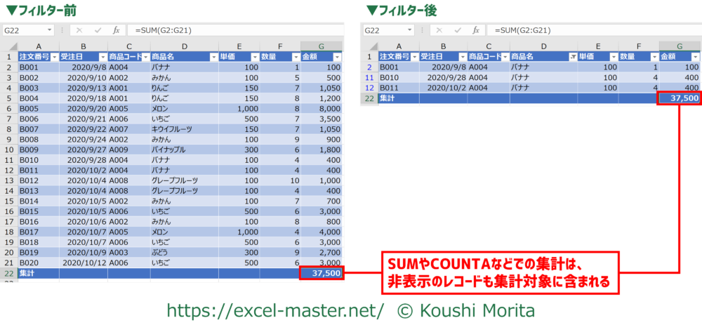 | 非表示の行を含む | 非表示の行は無視 | ||