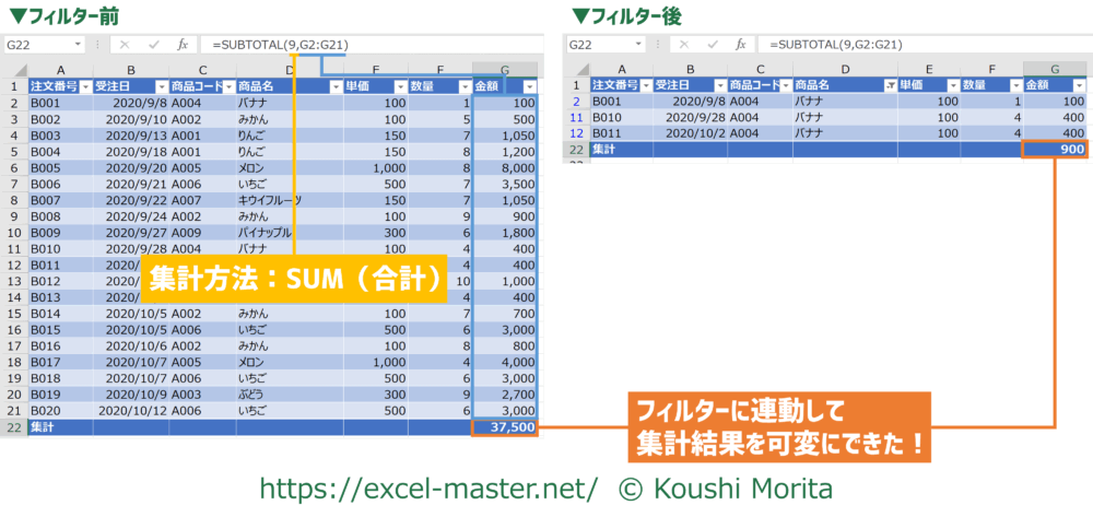 フィルター操作と連動して集計結果を可変にしたい場合は「SUBTOTAL」が有効