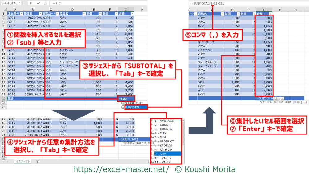 - サジェストから「SUBTOTAL」を選択し、「Tab」キーで確定