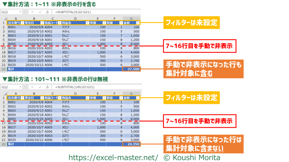実際に、手動で行を非表示にして合計を集計する場合に、「集計方法」が「9」と「109」で集計結果がどう変わるかを見てみましょう。