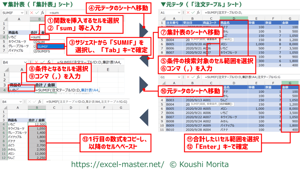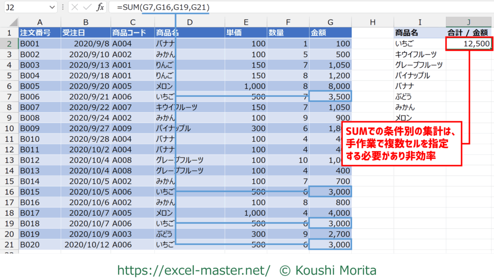 こうした条件別の合計を集計する際、商品名や日付などの条件に一致するレコードの数値データのみで合計すれば良いですが、頑張ればSUMでも集計は可能です。