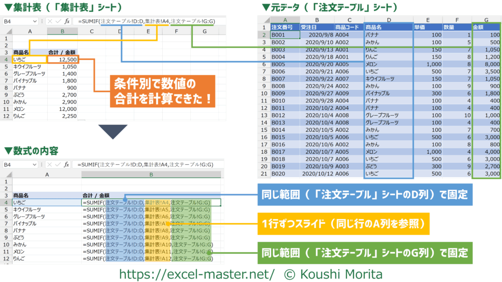 なお、SUMIFの数式を横方向にコピペする際、引数「範囲」を横にスライドさせたくない(固定にしたい)場合は、列を絶対参照にしましょう。