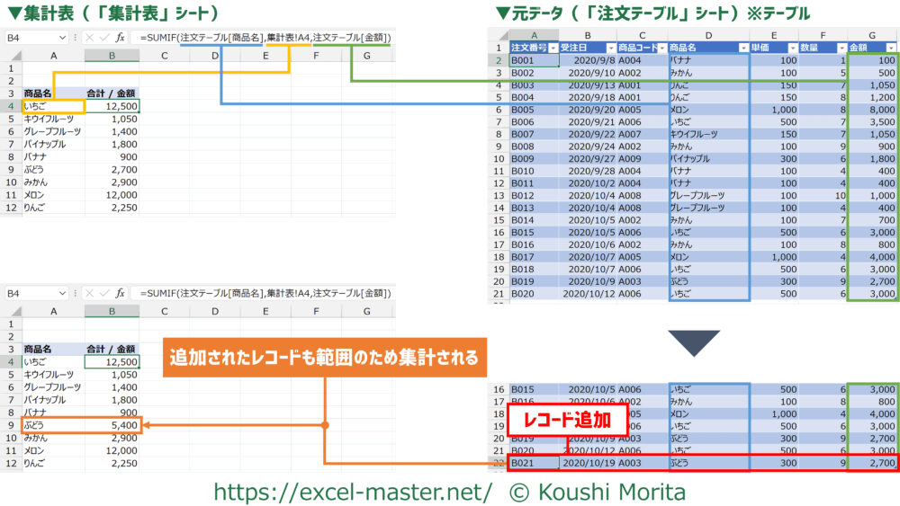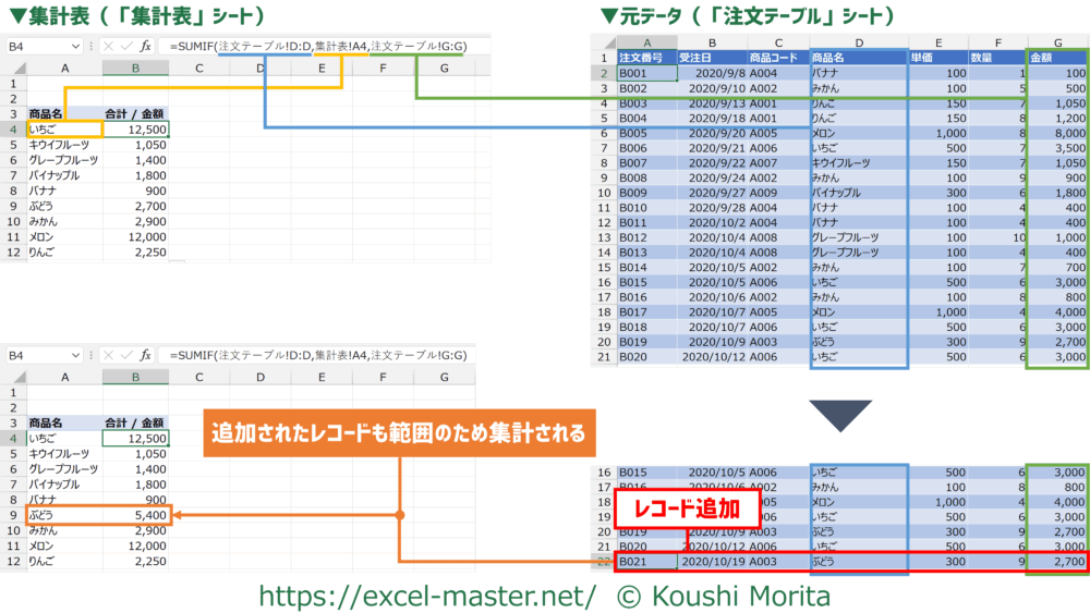 よって、SUMIFのセット時点で、元データにレコードが追加されても問題ない範囲指定を行いましょう。(詳細は以下参照)