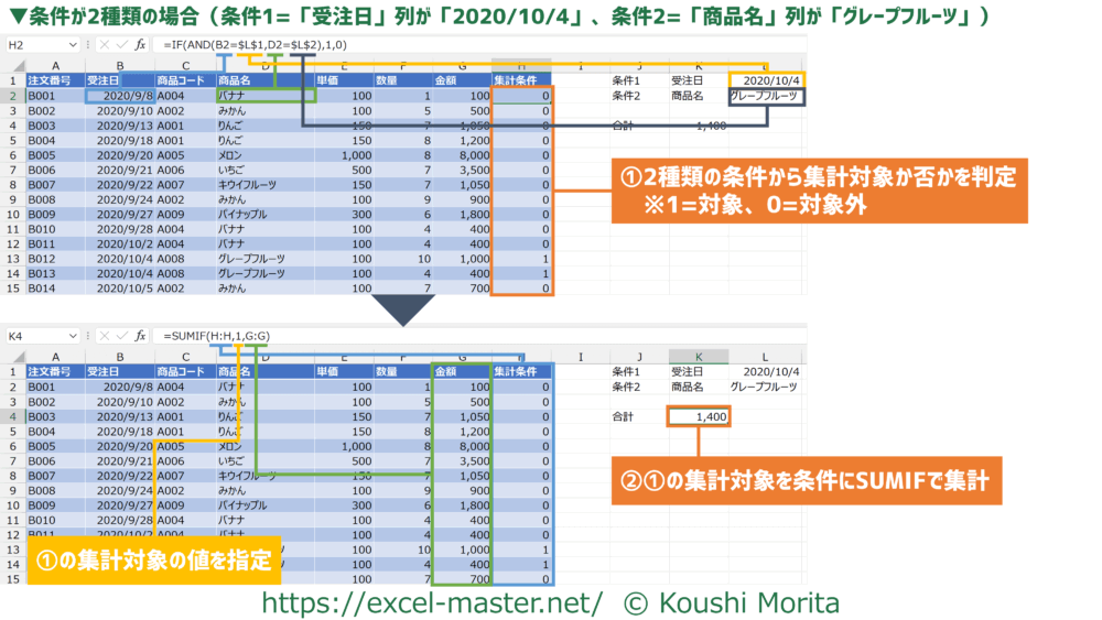 条件となる列はIF+ANDなどで集計対象のレコードを判定しておきましょう。