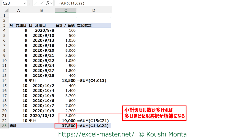 ただし、上記のように小計のセルが少なければ良いですが、小計のセルが多い場合、総計のSUMのセル選択が煩雑となり、選択ミスが起きる可能性も高まります。