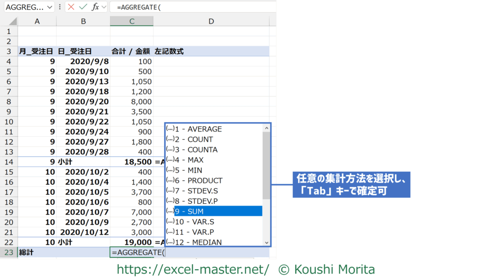 その際、引数「集計方法」の後にコンマ(,)を入力すると、数式上でサジェストされるため、任意のオプションを選択し「Tab」キーで確定しましょう。