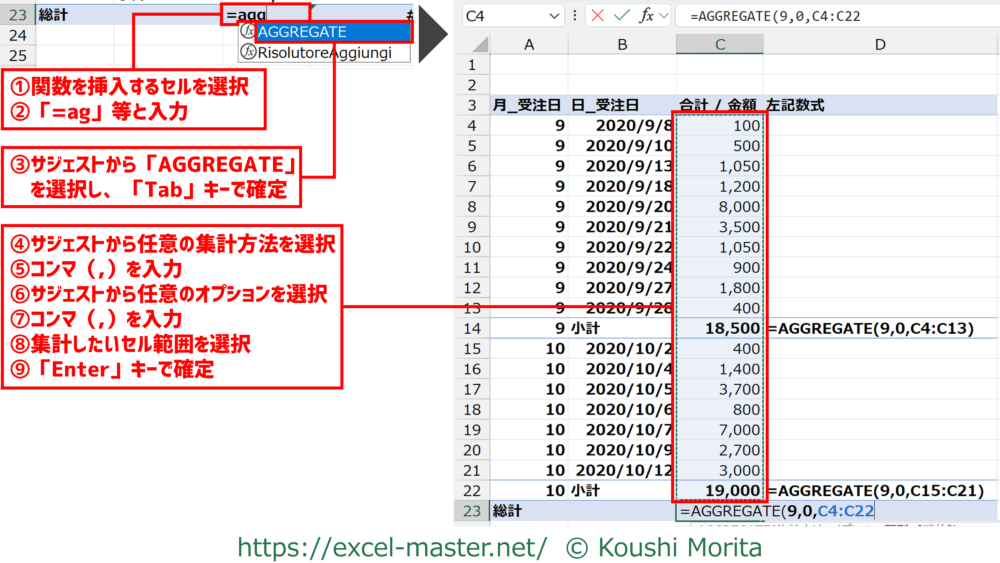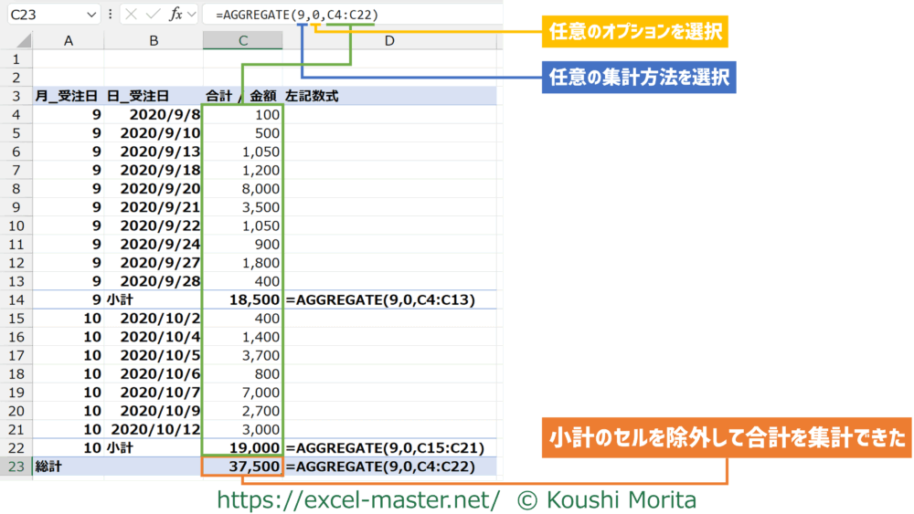 AGGREGATEを使うことで、小計を含んだセル範囲を指定しても、小計を除外して総計を集計することが可能になります。