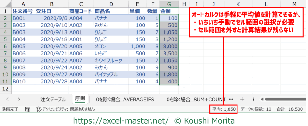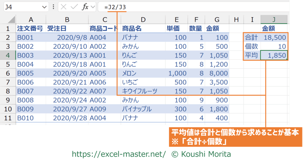 今回はAVERAGEで平均値を求めていますが、基本は「合計」と「個数」を集計した上で、平均値を「合計÷個数」で計算することです。