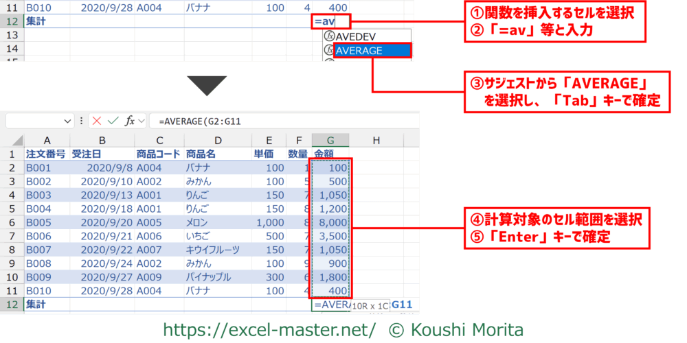 ※今回はG12セル - 「=av」等と入力