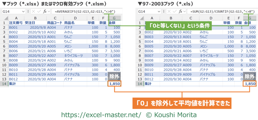 - ブック(*.xlsx)またはマクロ有効ブック(*.xlsm):AVERAGEIFS(比較演算子)