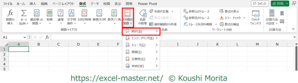 あくまで参考情報となりますが、AVERAGEはリボン「数式」タブの関数ライブラリの「統計」に分類されています。