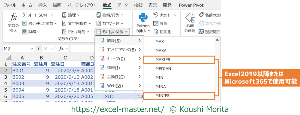 なお、Excel2019以降やMicrosoft365のバージョンであれば、条件別の最大値/最小値を集計できる「MAXIFS」・「MINIFS」が登場しています。
