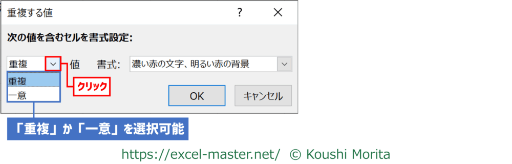 左側のボックスは、「重複」の他、「一意」(重複していない値)を選択できます。