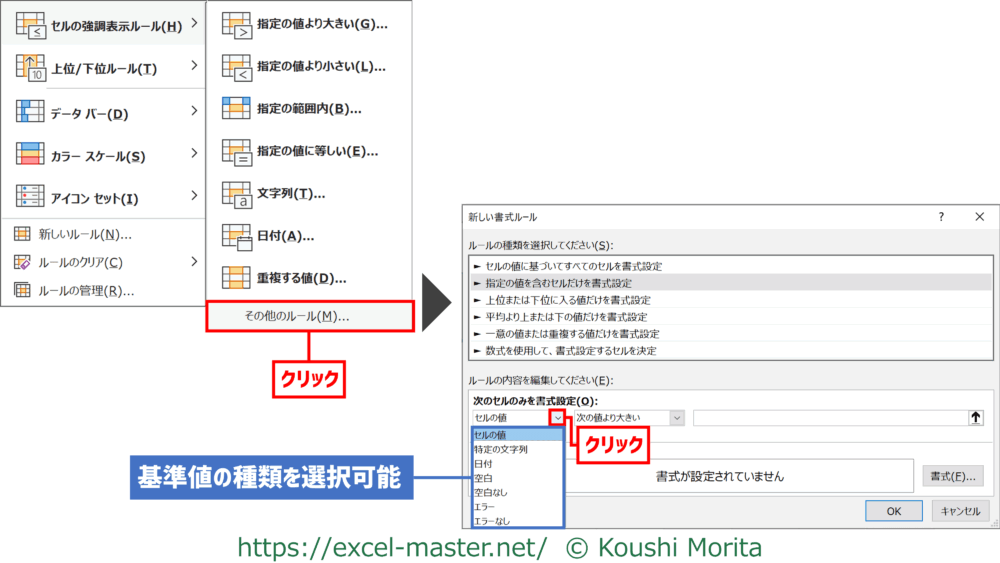当然、「基準値」も「条件付き書式を設定したセルの値」も数値(日付/時刻含む)である必要があります。
