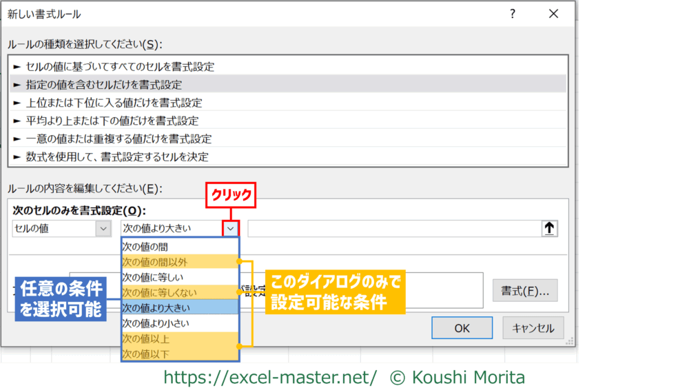 左側のボックスを「セルの値」にした場合、左から2番目のボックスで詳細な条件を選択できます。