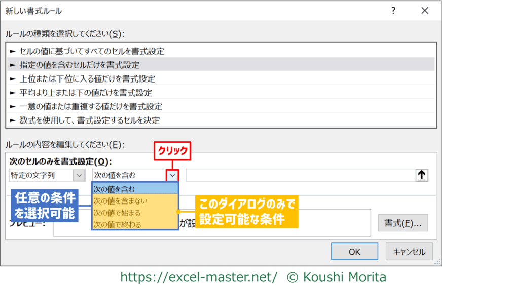 左側のボックスを「空白」または「空白なし」にすることも、このダイアログでしか設定できない条件となります。