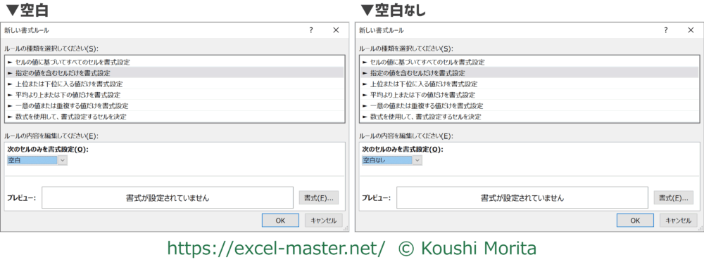 - 空白:「条件付き書式を設定したセルに値なし(=空白)」という条件