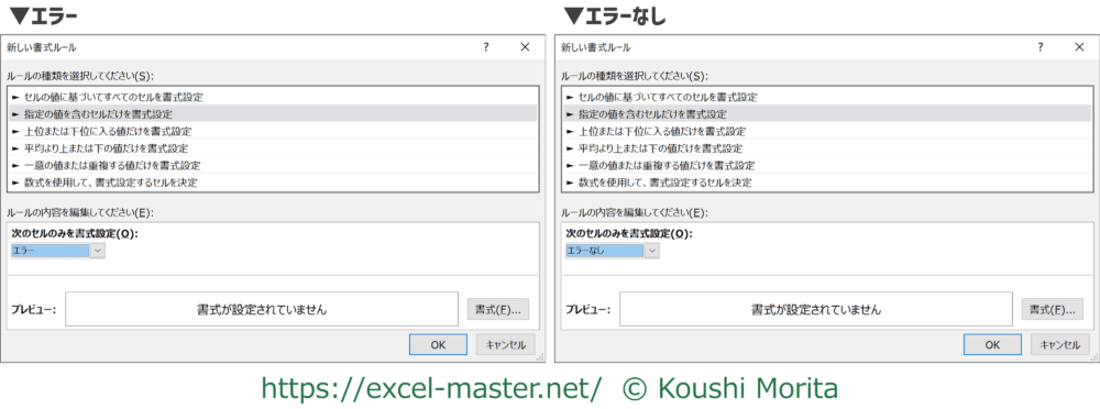 左側のボックスを「エラー」または「エラーなし」にすることも、このダイアログでしか設定できない条件となります。