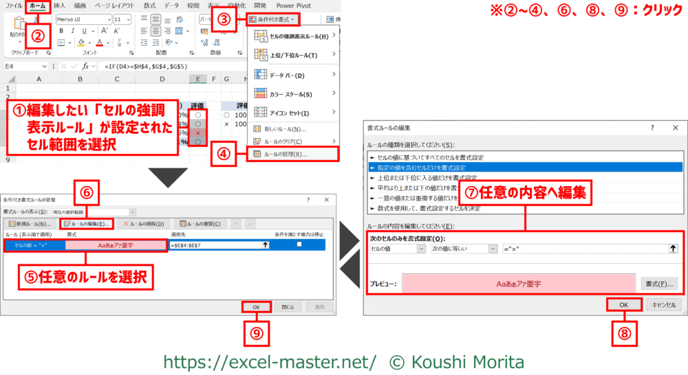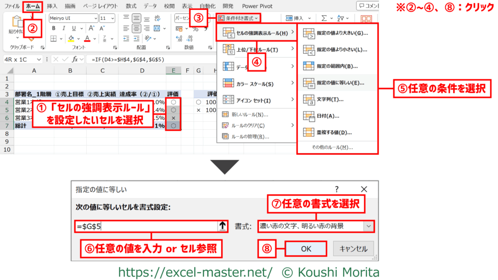 手順⑥はワークシート上に基準値を用意している場合、セル参照を優先すること(基準値の変更時、ワークシート上で変更が完結するため)。