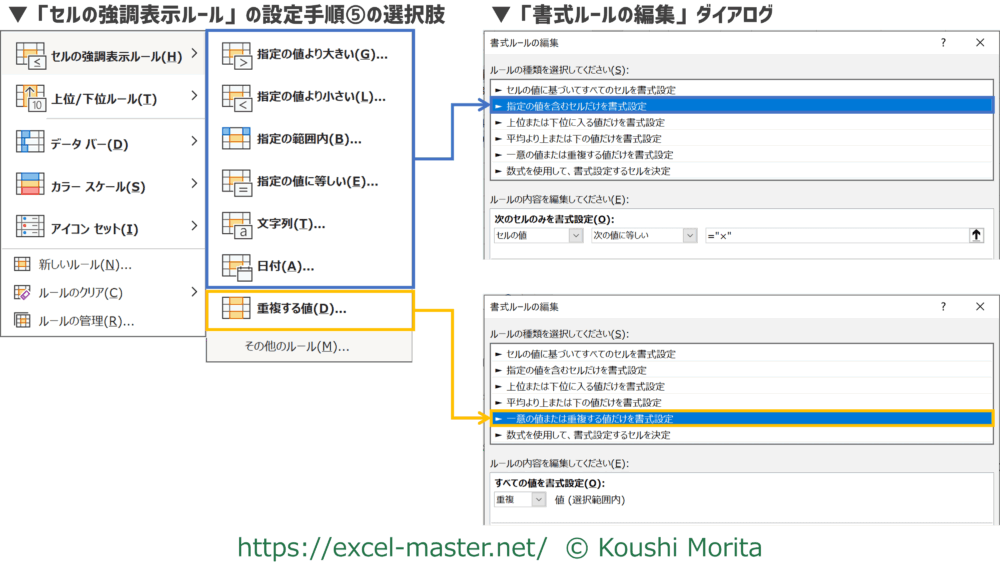 「セルの強調表示ルール」の設定手順⑤の選択肢にある「重複する値」のみ、「書式ルールの編集」ダイアログ上のルールの種類が異なります。