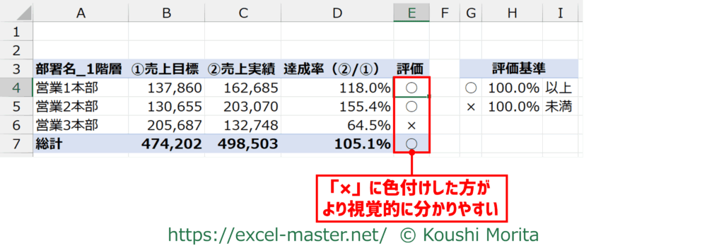 たとえば、「×」の場合にセルの塗りつぶしが赤になっていたら、悪い結果だと視覚的に分かりやすくなりますね。
