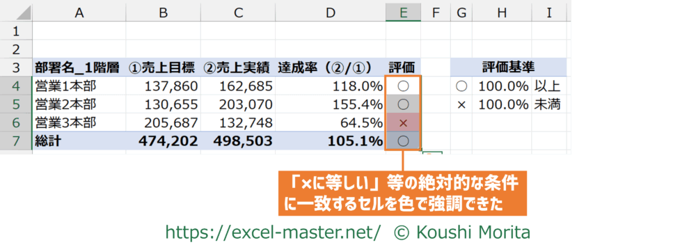これでも目標達成有無は分かりやすくなりますが、もっと結果の良し悪しを視覚的に分かりやすくするには「色」も活用すると良いです。