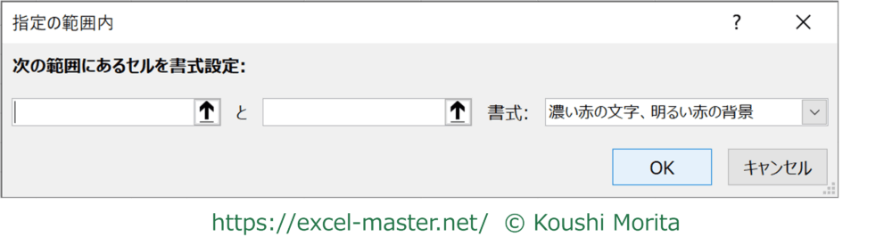 この条件を選択時に起動する「指定の範囲内」ダイアログは、基準値を設定するボックスが1つ増えます。